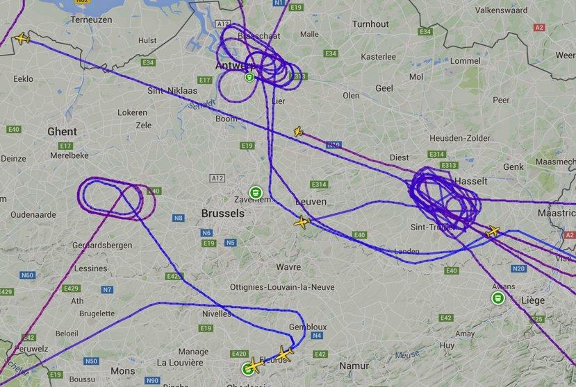 Samoloty, które zmierzały na brukselskie lotnisko, zostały zawrócone. Część cały czas krąży w pobliżu. Tak wyglądał ten moment na Plane Finder (stronie, która zajmuje się monitorowaniem lotów).