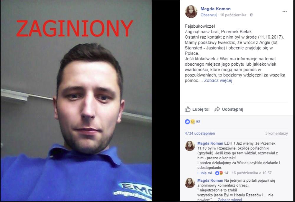 Według komentarzy na portalu społecznościowym Facebook mężczyzna 11.10 był w Rzeszowie, w okolicach politechniki.