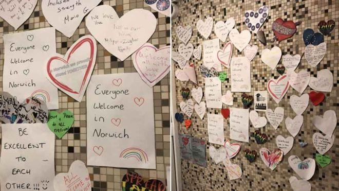 Mieszkańcy bloku Winchester w Norwich powiedzieli „dziękuję” europejskim przyjaciołom w wielu językach – niosąc w ten sposób przesłanie, że są solidarni z imigrantami i nie popierają osoby, która rozwiesiła tą bulwersującą ulotkę.