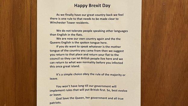 Mieszkańcy bloku, w którym pojawiły się ulotki „Happy Brexit Day”, wywieszają pozytywne wiadomości, w których wyrażają wspólnotę z imigrantami.