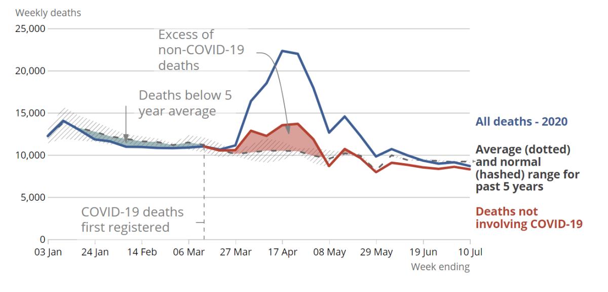 Fakt, że liczba zgonów innych niż COVID-19 osiągnęła szczyt w tym samym czasie, co zgony z powodu COVID-19, ONS tłumaczy tym, że część zgonów innych niż COVID-19 we wcześniejszych miesiącach mógł być w rzeczywistości spowodowany bezpośrednio przez niezdiagnozowany COVID-19.
