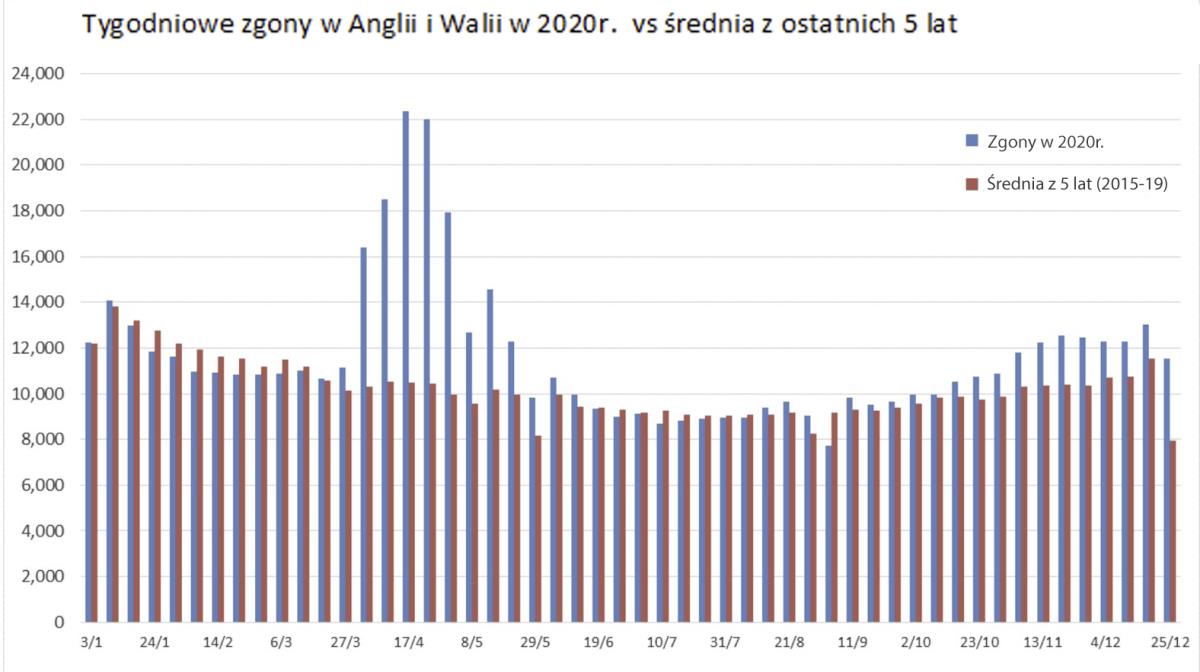 Według danych z 6 stycznia, które mogą jeszcze nie zawierać wszystkich zgonów, w 2020 roku w Anglii i Walii zmarło 604 045 osób, w roku 2019 odnotowano 527 234 zgonów, a średnia liczba zgonów z ostatnich 5 lat wynosi 531 129.